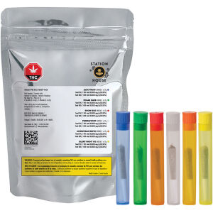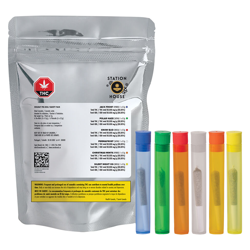 The Station House Holiday Variety Pack is the stocking stuffer of the year, for real! This ultimate strain sampler features six limited edition festive strains in a 6×0.5g pre-roll pack. Enjoy the freshness of Permafrost, the smoothness of Polar Haze, and the minty delight of Christmas Mints. Embrace the crispness of Jack Frost, the sweet, fresh taste of Snow Bud, and the subtle notes of Silent Night OG.