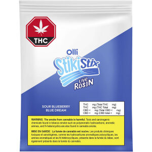 Our StikiStix Live Rosin gummies are differentiated by using strain-specific live rosin. Olli Live Rosin Sour Blueberry Blue Dream delivers a smooth blend of Blue Raspberry flavour with a chewy texture and a fun, splittable shape. Infused with 10 mg of THC and crafted for a true-to-strain experience, this gummy offers a flavourful and functional twist on a classic cultivar.