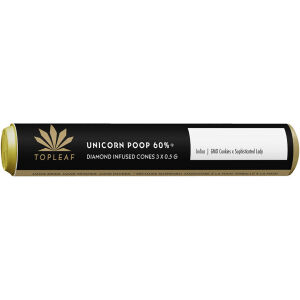 Get ready for a magical experience with Unicorn Poop, a potent indica that blends sweet, earthy flavours and pungent gas notes. Top Leaf’s Unicorn Poop 60%+ Infused Pre-Roll blends premium full flower with potent THC diamonds for a high-potency experience.